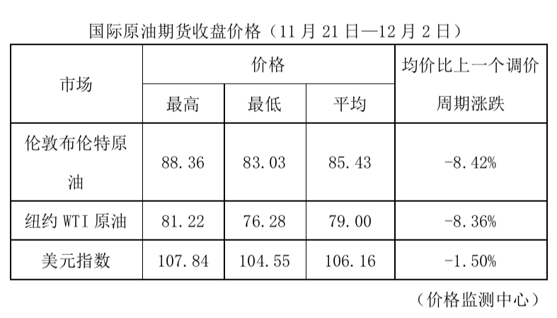 根據(jù)國家發(fā)改委消息,新一輪成品油調(diào)價窗口將于12月5日24時開啟。據(jù)國家發(fā)改委價格監(jiān)測中心監(jiān)測,本輪成品油調(diào)價周期內(nèi)(11月21日—12月2日)國際油價大幅下降。平均來看,倫敦布倫特、紐約WTI油價比上輪調(diào)價周期下降8.39%。