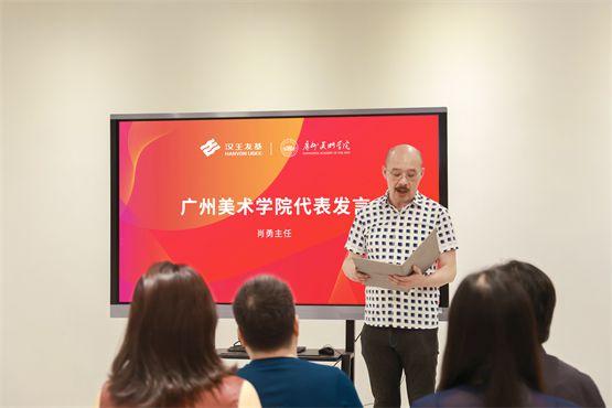 儀式上,廣州美術學院教學實驗中心肖勇主任向漢王友基一行表示熱烈歡迎,并介紹學校發(fā)展情況。他指出,經過廣州美術學院校友辦、影視后期基地與漢王友基的充分溝通,雙方發(fā)揮優(yōu)勢互補,達成此次校企戰(zhàn)略合作的重要舉措。影視后期教育基地的落成,將聚焦在人才培養(yǎng)、專業(yè)共建、數字藝術、設計生態(tài)等多方面,開拓校企合作的新領域與新途徑,共同培養(yǎng)高素質人才,打造粵港澳大灣區(qū)教育基地。