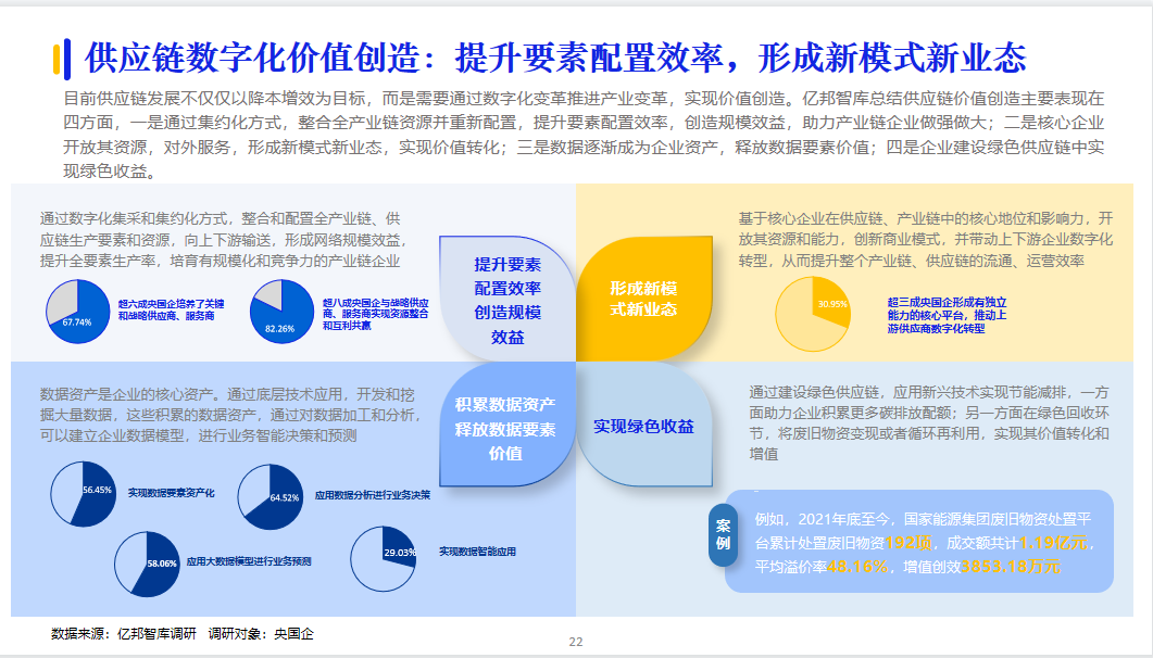 目前供應(yīng)鏈發(fā)展不僅僅以降本增效為目標(biāo),而是需要通過數(shù)字化變革推進產(chǎn)業(yè)變革,實現(xiàn)價值創(chuàng)造。億邦智庫總結(jié)供應(yīng)鏈價值創(chuàng)造主要表現(xiàn)在四方面,一是通過集約化方式,整合全產(chǎn)業(yè)鏈資源并重新配置,提升要素配置效率,創(chuàng)造規(guī)模效益,助力產(chǎn)業(yè)鏈企業(yè)做強做大;二是核心企業(yè)開放其資源,對外服務(wù),形成新模式新業(yè)態(tài),實現(xiàn)價值轉(zhuǎn)化;三是數(shù)據(jù)逐漸成為企業(yè)資產(chǎn),釋放數(shù)據(jù)要素價值;四是企業(yè)建設(shè)綠色供應(yīng)鏈中實現(xiàn)綠色收益。