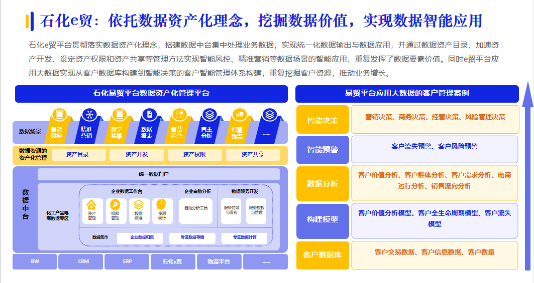 數(shù)字化采購帶來三大供應(yīng)鏈模式變革:商業(yè)模式、管理模式和服務(wù)模式。核心企業(yè)依托資源聚集優(yōu)勢,將其資源整合能力和管理能力向外開放和輸出,提供開放的平臺,實現(xiàn)盈利,引起商業(yè)模式變革;同時,數(shù)據(jù)價值逐漸被釋放,實現(xiàn)數(shù)據(jù)驅(qū)動的供應(yīng)鏈管理模式的變革;例如:石化e貿(mào)落實數(shù)據(jù)資產(chǎn)化理念,搭建數(shù)據(jù)中臺集中處理業(yè)務(wù)數(shù)據(jù),實現(xiàn)數(shù)據(jù)智能應(yīng)用。
