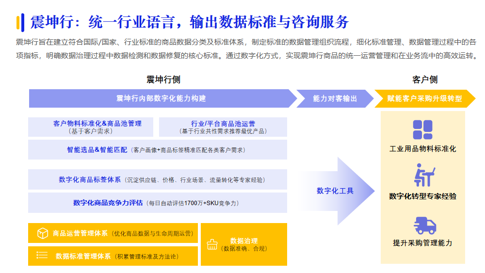為企業(yè)提供場景、行業(yè)適配的產(chǎn)品與服務(wù)是供應(yīng)商的基礎(chǔ)能力。可以借助AI等數(shù)字化技術(shù)服務(wù),基于場景梳理的標(biāo)準(zhǔn)化實現(xiàn)商品智能匹配,已經(jīng)成為供應(yīng)商服務(wù)升級的方向。例如:震坤行通過建立國際/國家、行業(yè)標(biāo)準(zhǔn)的商品數(shù)據(jù)分類及標(biāo)準(zhǔn)體系,明確數(shù)據(jù)治理過程中數(shù)據(jù)檢測和數(shù)據(jù)修復(fù)的核心標(biāo)準(zhǔn),再基于場景梳理,建立數(shù)字化商品標(biāo)簽體系,實現(xiàn)震坤行商品的統(tǒng)一運營管理和在業(yè)務(wù)流中的高效運轉(zhuǎn)。