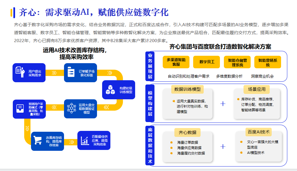今年還有不少供應(yīng)商在數(shù)字供應(yīng)鏈建設(shè)方面,推出升級的智能化服務(wù)。比如,齊心引入AI技術(shù)構(gòu)建可匹配多場景的AI業(yè)務(wù)模型,為企業(yè)匹配最佳履約交付方式。