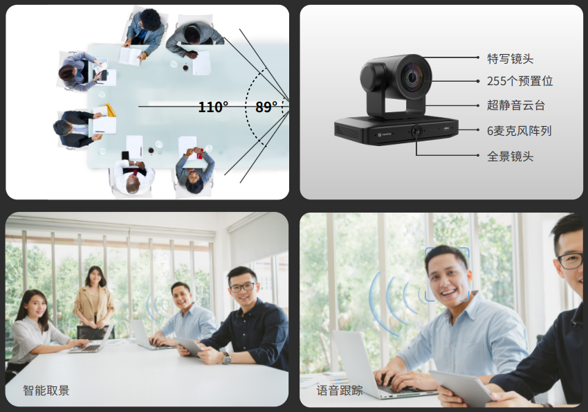 攝像系統(tǒng)由12倍光學(xué)變焦特寫(xiě)鏡頭和110°大廣角的全景鏡頭組成,特寫(xiě)鏡頭可視角達(dá)89°,可將畫(huà)面無(wú)損放大至12倍,加上自動(dòng)對(duì)焦,不僅能捕捉所有參會(huì)人的表情和動(dòng)作,會(huì)議室中的文件和白板內(nèi)容都能在遠(yuǎn)端輕松觀看。同時(shí),作為一款會(huì)議云臺(tái)攝像頭,它能通過(guò)6顆麥克風(fēng)陣列,鎖定發(fā)言人位置,電機(jī)實(shí)時(shí)穩(wěn)定安靜快速地運(yùn)行轉(zhuǎn)動(dòng)到當(dāng)前發(fā)言人,覆蓋會(huì)議室多個(gè)角度,讓遠(yuǎn)程的參會(huì)人更具沉浸感和參與感。