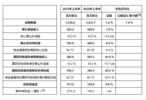 所有財務(wù)數(shù)據(jù)均以百萬歐元(€m)為單位。除非另有說明,本報告的業(yè)績涵蓋2023年6月30日之前的6個月期間(2023年上半年)和2023年6月30日之前的3個月期間(2023年第二季度),而進行數(shù)據(jù)對比的對象為2022年6月30日之前的6個月期間(2022年上半年)和2022年6月30日之前的3個月期間(2022年第二季度)。除非另有說明,否則評論基于2023年上半年的業(yè)績。所有評論和較之前業(yè)績的比較均不包括2022年7月剝離的多元健康(CHC)業(yè)務(wù)的業(yè)績。