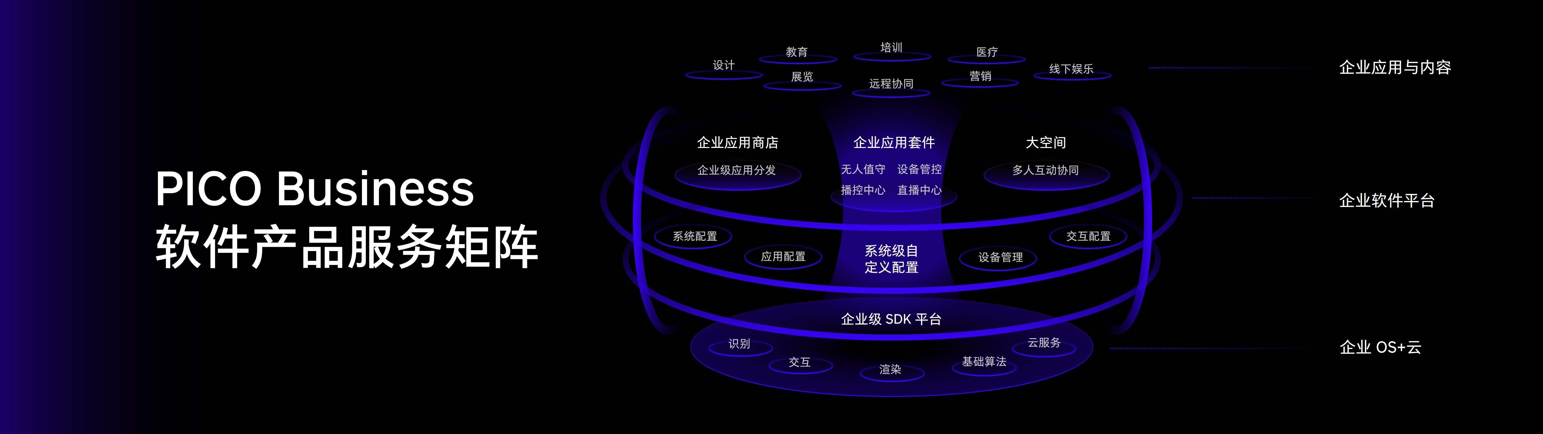 PICO Business是PICO旗下企業(yè)服務(wù)品牌,具備企業(yè)級(jí)硬件、企業(yè)級(jí)OS、企業(yè)級(jí)軟件平臺(tái)和企業(yè)級(jí)服務(wù)等能力,能為企業(yè)用戶提供全面、成熟的XR解決方案與最佳實(shí)踐,幫助用戶提升業(yè)務(wù)效率,降低部署的成本和門檻,解決業(yè)務(wù)中面臨的技術(shù)挑戰(zhàn),創(chuàng)造全新價(jià)值。截止目前,全球已經(jīng)有超過4000家企業(yè)客戶與PICO Business合作,面向教育、培訓(xùn)、醫(yī)療、營銷、展覽、線下娛樂、3D設(shè)計(jì)協(xié)作、遠(yuǎn)程協(xié)同等場(chǎng)景輸出了軟硬件一體的解決方案,幫助企業(yè)降本增效、提升競爭力。