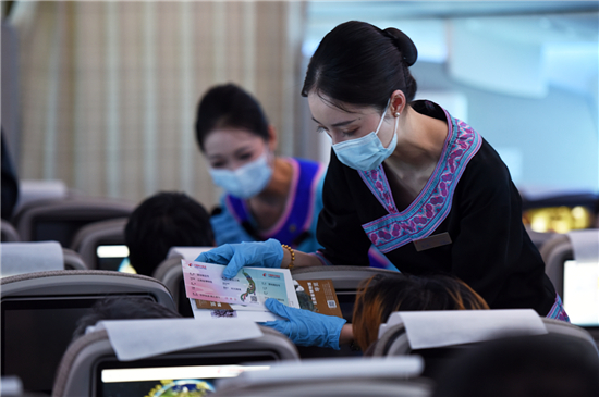 “女士們、先生們,歡迎您乘坐本次‘凌云逐夢(mèng) 尋秘云滇’東航博物館奇妙游主題航班。今天,中國(guó)東航聯(lián)合云南省博物館將在萬(wàn)米高空的客艙為您帶來(lái)一場(chǎng)奇妙的空中博物館之旅,和您一起解鎖云南文明密碼、探秘云南歷史文化、欣賞云南寶藏精粹、走進(jìn)云南文明的‘靈魂客廳’。祝愿您有一段愉快而舒適的旅程……”飛機(jī)平飛后,客艙中廣播響起,身著布依族、彝族、布朗族、白族等少數(shù)民族服裝的乘務(wù)員將擺滿(mǎn)“牛虎銅案”“四牛鎏金騎士銅貯貝器”“大鵬金翅鳥(niǎo)”“聶耳小提琴”等博物館文創(chuàng)及東航系列禮品包括機(jī)長(zhǎng)熊、乘務(wù)長(zhǎng)熊、小飛機(jī)掛件等獎(jiǎng)品的餐車(chē)推進(jìn)客艙,與旅客開(kāi)啟了有獎(jiǎng)知識(shí)問(wèn)答。