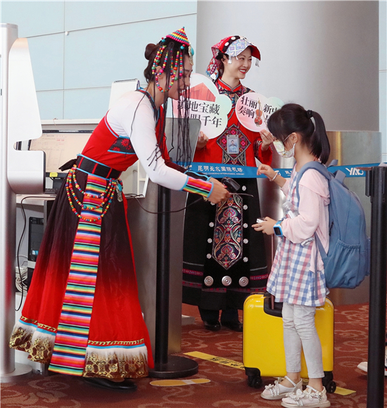 首航當(dāng)天,東航工作人員身著少數(shù)民族服裝,用親切的民族方言向旅客問(wèn)好,引導(dǎo)旅客辦理乘機(jī)手續(xù)。主題航班專(zhuān)屬柜臺(tái)前,頗有云南歷史文化元素的海報(bào)引得旅客駐足觀看,“媽媽,這是我們?cè)谖麟p版納看到過(guò)的孔雀嗎?”“哇,你看,這是大鵬金翅鳥(niǎo),我在云南省博物館見(jiàn)到過(guò)。”小旅客從辦理值機(jī)就開(kāi)始期待這趟精彩的空中博物館之旅。