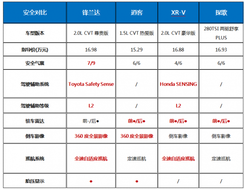 而在主動(dòng)安全配置上,四款車型中僅有2款提供了選擇,分別為鋒蘭達(dá)搭載的T-PILOT智能駕駛輔助,以及XR-V的Honda SENSING駕駛輔助系統(tǒng),兩車的功能性方面均滿足L2級的自動(dòng)駕駛。并且兩車的主動(dòng)安全都近乎實(shí)現(xiàn)全系標(biāo)配,這也讓購車的消費(fèi)者不用過多在主動(dòng)安全以及更高的預(yù)算上左右為難。