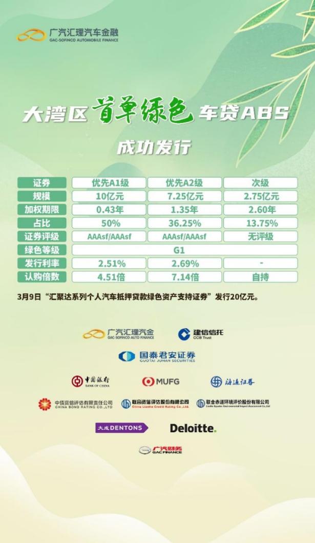 與此同時(shí),廣汽匯理良好的綠色金融資產(chǎn)也獲得了資本市場的認(rèn)可。今年3月9日,廣汽匯理發(fā)行了粵港澳大灣區(qū)首單綠色車貸ABS——匯聚達(dá)2023年第一期個(gè)人汽車抵押貸款綠色資產(chǎn)支持證券。本次入池資產(chǎn)均為廣汽埃安品牌新能源汽車個(gè)人貸款,經(jīng)綠色認(rèn)證機(jī)構(gòu)聯(lián)合赤道評(píng)估分析,入池資產(chǎn)對(duì)應(yīng)的新能源汽車,預(yù)計(jì)每年可實(shí)現(xiàn)二氧化碳減排6.07萬噸,節(jié)約標(biāo)準(zhǔn)煤2.85萬噸,有效地助力了我國節(jié)能減排事業(yè)開展。