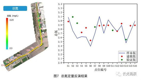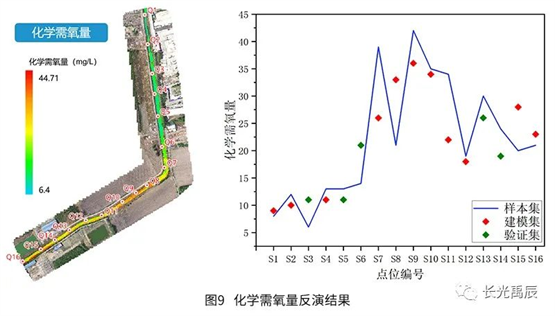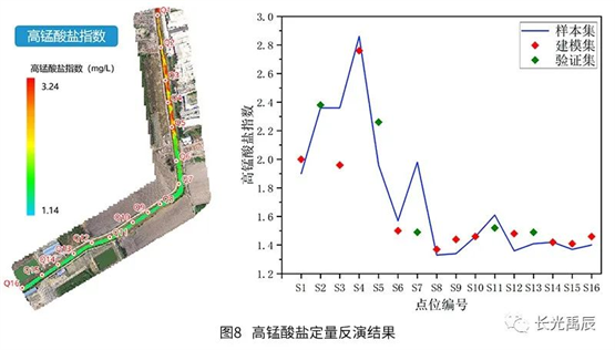 精度評定結(jié)果見表2.各水質(zhì)參數(shù)的平均相對誤差均在25%以下,可滿足常態(tài)化、高頻次的全局水質(zhì)檢測需求。化學(xué)需氧量反演誤差稍大是因為該條河道整體水質(zhì)情況存在較大的空間異質(zhì)性,河道不同河段中有機物含量差異較大,而水體化學(xué)需氧量與有機物濃度密切相關(guān),所以這種變化較快的梯度可能會引入一定的誤差,模型也有繼續(xù)優(yōu)化的空間。