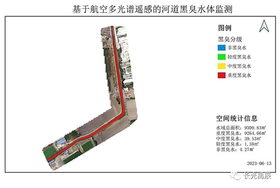 黑臭水體是指水質(zhì)污染嚴重、水體顏色異常、散發(fā)惡臭的情況。它通常由生活污水、工業(yè)廢水和農(nóng)業(yè)排放物等引起,造成環(huán)境破壞和健康風(fēng)險。通過無人機多光譜遙感技術(shù),結(jié)合水色與實測水質(zhì)參數(shù)數(shù)據(jù)的分析,對本次實驗河道黑臭水污染的識別情況如圖5所示。