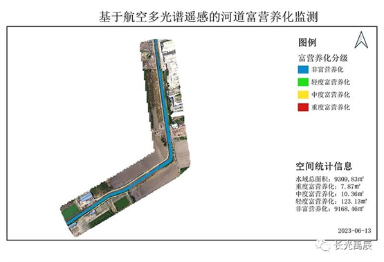 水體富營養(yǎng)化是指水中營養(yǎng)物質(zhì)(如氮、磷)過度積累,導(dǎo)致水體中藻類、水生植物大量繁殖的現(xiàn)象。水體富營養(yǎng)化會造成藻類過度生長,破壞水生態(tài)系統(tǒng)的平衡,甚至引發(fā)水體死亡。通過無人機多光譜遙感技術(shù),結(jié)合實測水質(zhì)參數(shù)數(shù)據(jù)的分析,對本次實驗河道水體富營養(yǎng)化的識別情況如圖4所示。