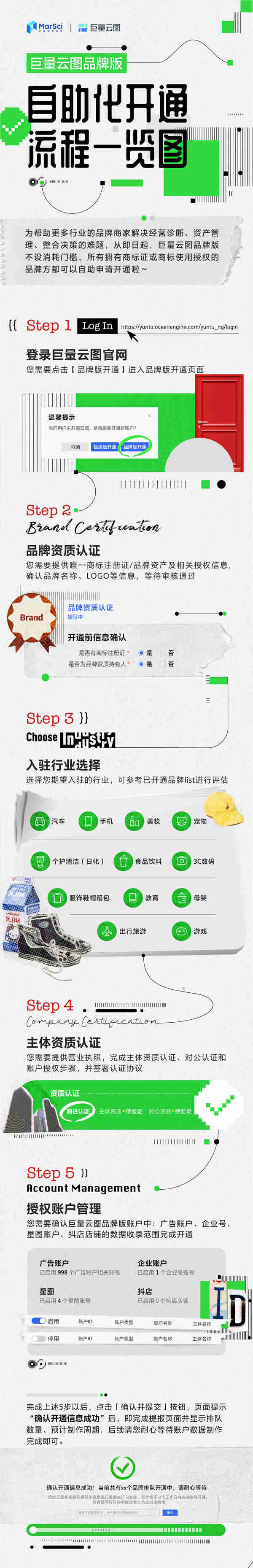為幫助更多行業(yè)的品牌商家解決經(jīng)營、管理、決策難題,巨量云圖品牌版自助化開通能力已上線,不設(shè)消耗門檻、無需直客銷售提報,所有持有商標(biāo)證或商標(biāo)使用授權(quán)的品牌,在登陸官網(wǎng)后,均可根據(jù)流程指引進行自助化開通。