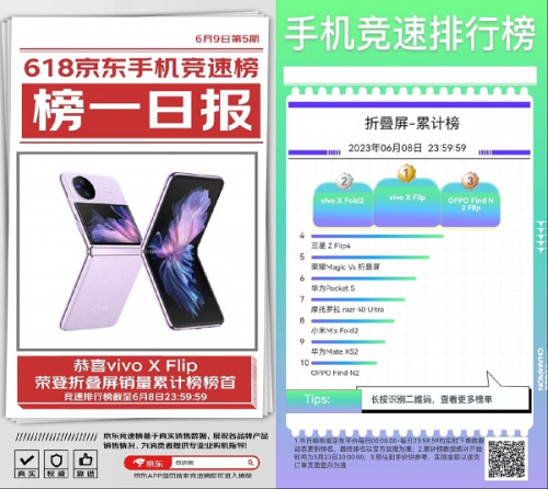 最近京東618火熱進行中,囤完日用品,也該將自己卡頓或拍攝性能落后的手機換新了。除了性能出色的直板智能機,還可以選擇嘗鮮,換新折疊屏手機試試。不過很多人都表示自己平時也不關(guān)注手機圈的事情,配置也就看個大概,不知道怎么選。沒關(guān)系,京東618推出了手機競速排行榜,京東APP搜索“競速榜”即可進入,不同喜好和預(yù)算都能選到適合的產(chǎn)品,其中就有折疊屏手機銷量累計榜。截至6月8日,vivo X Flip、vivo X Fold2、OPPO Find N2 Flip成為折疊屏手機銷量累計榜TOP3,下面就帶大家一起看看這些在榜折疊屏手機。