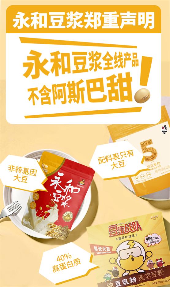 不含阿斯巴甜!永和食品的鄭重聲明給了消費(fèi)者一顆定心丸。40年品質(zhì)經(jīng)營(yíng),永和食品以其兼具營(yíng)養(yǎng)與口感的豆?jié){粉產(chǎn)品,打造健康飲品,掀起清涼一夏。
