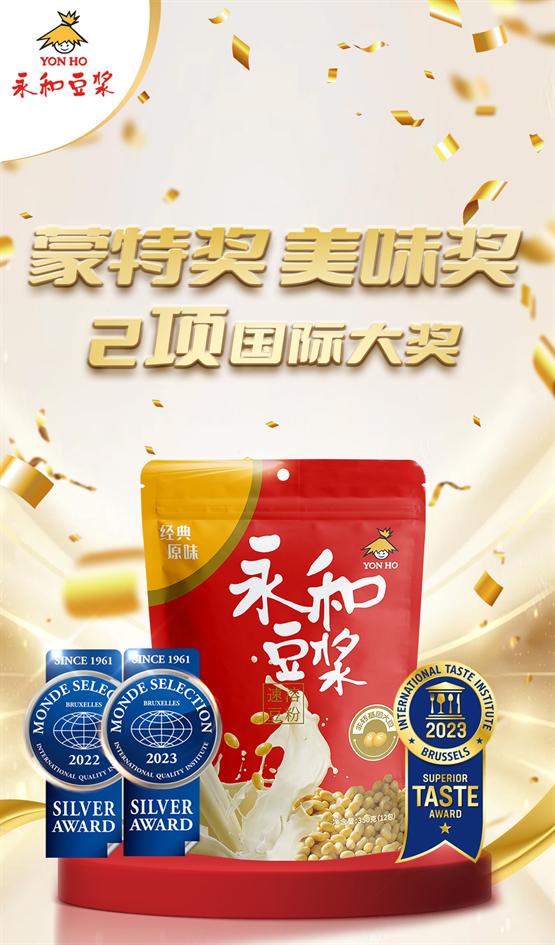 2022-2023年,永和食品旗下350g經(jīng)典原味豆?jié){粉先后蟬聯(lián)2屆國際蒙特獎(jiǎng),并與純豆?jié){粉一起榮獲國際美味獎(jiǎng)風(fēng)味認(rèn)證。硬核實(shí)力,向全球消費(fèi)者展現(xiàn)出了中國豆?jié){品牌的品質(zhì)與自信。國際大獎(jiǎng)?wù)J證的健康飲品,值得信賴!