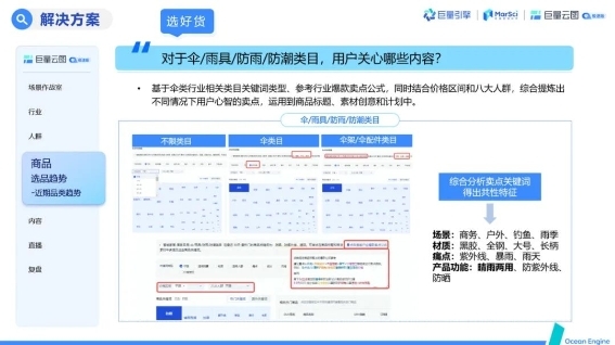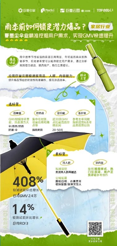 作為家居百貨行業(yè)代表,雨傘品類季節(jié)性更強,上述問題也更為凸顯,年初雖然尚未到雨季熱銷節(jié)點,但工廠希望可以精準鎖定用戶需求,提前儲備新的爆品,未雨綢繆。如何準確選出潛力爆品,并篩選精準人群提高投產(chǎn),助力生意增長?