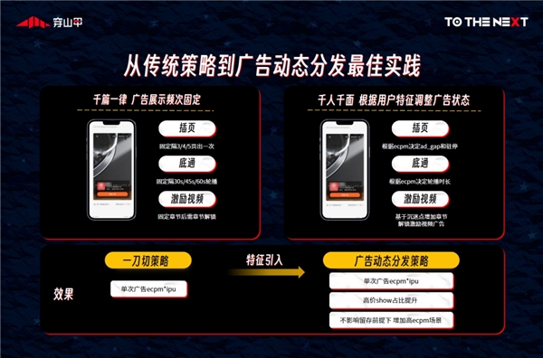▎閱讀行業(yè):?為避免過往千篇一律的廣告展示影響用戶體驗(yàn),穿山甲基于GroMore獨(dú)特的用戶價(jià)值分組能力,借助用戶所看書籍類型、閱讀速度、在線時(shí)長、累計(jì)觀看廣告數(shù)量等不同參數(shù),為開發(fā)者建立了一套用戶分層策略。通過“廣告動(dòng)態(tài)分發(fā)”,根據(jù)用戶特征及時(shí)調(diào)整廣告狀態(tài),在不影響用戶留存的情況下進(jìn)一步提升廣告arpu,實(shí)現(xiàn)LTV最大化。