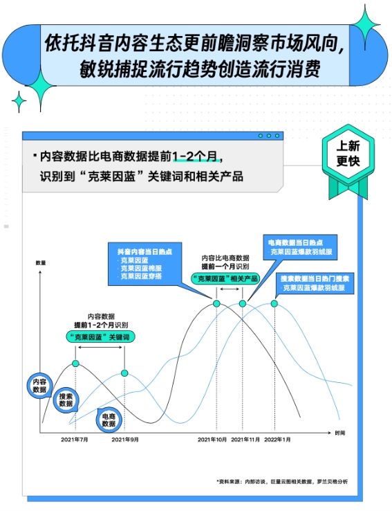 看似無序的消費決策遵循一套基礎邏輯,比如購買普遍發(fā)生在瀏覽和搜索之后。所以,內容數(shù)據(jù)和搜索數(shù)據(jù)可以被視為交易的前置指標,它們能夠更早預測未來交易走向。正是基于這一結論,擁有內容場監(jiān)測能力的巨量云圖能更快識別出新品市場機會,為品牌上新提供參考。