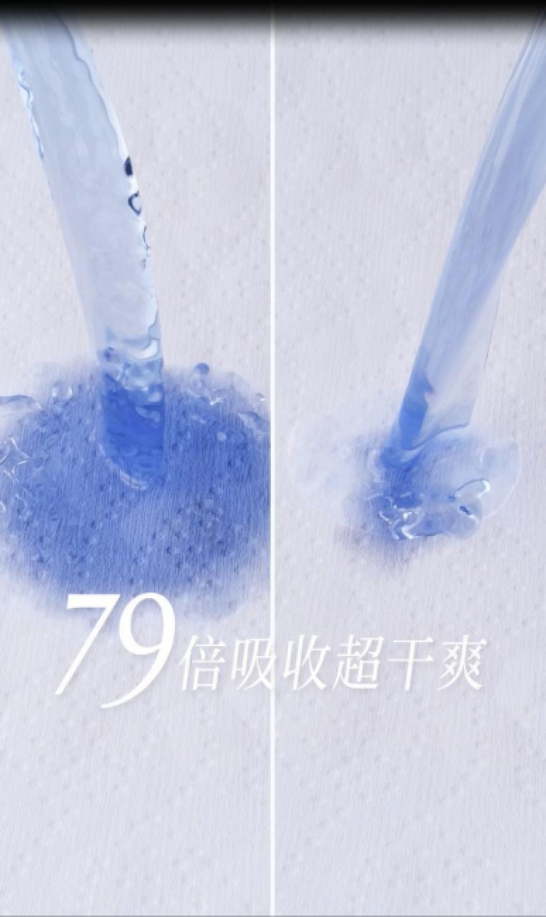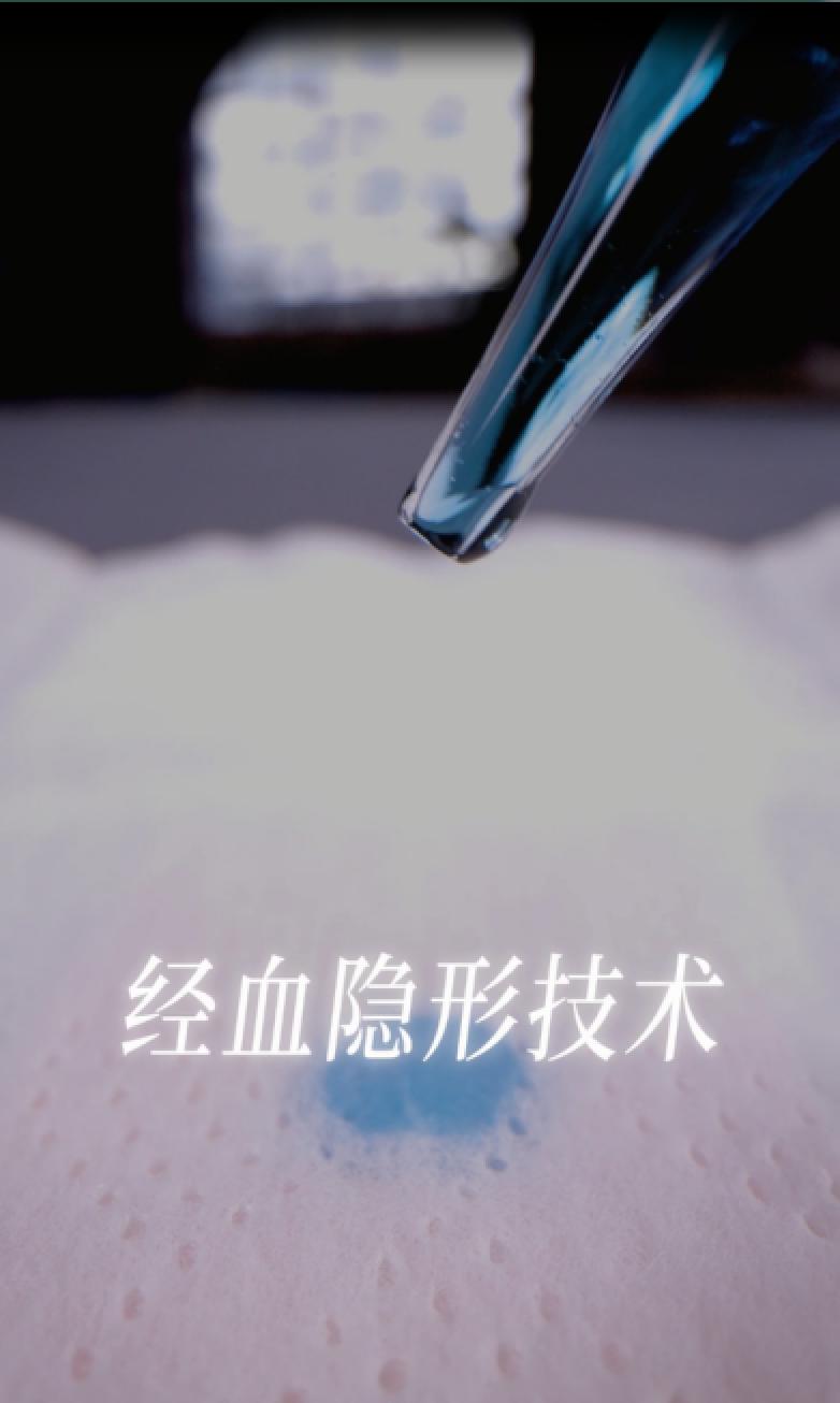 因此,從女性體感出發(fā),棉密碼無痕系列的面層、芯體全面創(chuàng)新。其中一大亮點在經(jīng)血隱形科技上,在面層與芯體材質(zhì)的共同作用下,能夠在經(jīng)血接觸后快速下滲,并在底部擴散,視覺看起來表面只有一點點,減少表層接觸肌膚的粘膩度,從而真正實現(xiàn)“視覺無感”。