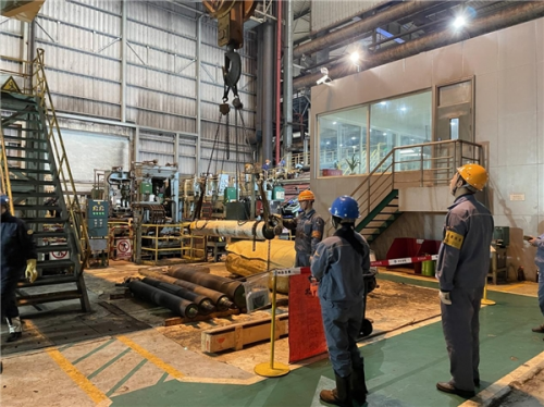 專、研在這里,抓住重點(diǎn)迎難而上,這次定修中有好多項目首次碰到,對這些史無前例的吊運(yùn)作業(yè),精心組織、周密部署、根據(jù)各機(jī)組的空間結(jié)構(gòu)制定的吊運(yùn)方案,尤其是3#CGL熱鍍鋅C808機(jī)組鋅鍋技改項目增加鋅鍋感應(yīng)加熱器線圈套裝任務(wù),中冶寶鋼基層單位認(rèn)真梳理吊裝成功的經(jīng)驗(yàn),大膽創(chuàng)新,建議施工方采用三級指揮方式進(jìn)行指揮吊裝作業(yè),并使用專業(yè)工具橋架直接吊運(yùn),兩端使用麻繩做牽引固定,從C808機(jī)組9層平臺至上而下,省略了諸多中間環(huán)節(jié),打破崗位壁壘的束縛,僅僅只用了一個晝夜的時間,鋅鍋感應(yīng)加熱器線圈順利吊裝就位。比原定計劃提前了一天時間。