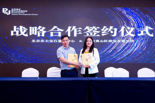 活動現(xiàn)場,北京北大寶石鑒定中心與北京真心紅珠寶有限公司還舉辦了現(xiàn)場簽約儀式,雙方將在珠寶鑒定、數(shù)字化溯源以及從業(yè)人員專業(yè)培訓等多個版塊開展豐富的合作。