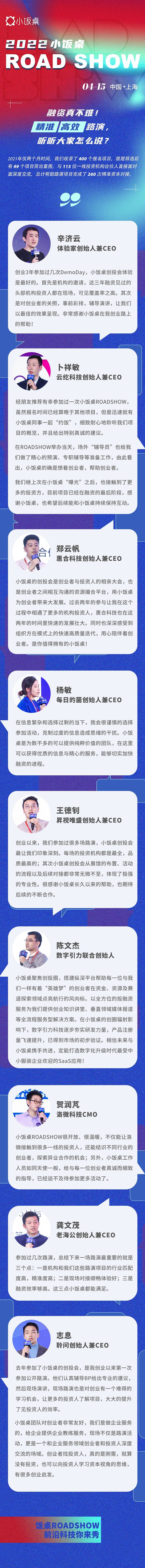 導(dǎo)語:4月15日,2022小飯桌ROASHOW將登陸上海,將開設(shè)“新能源與新材料”、“企業(yè)服務(wù)與工業(yè)科技”、“生物技術(shù)與醫(yī)療健康”賽道專場(chǎng)路演,歡迎各位優(yōu)秀的科技創(chuàng)業(yè)者前來應(yīng)戰(zhàn)!