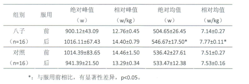 在減少脂肪含量的同時(shí),還要注意增加肌肉量。這里要關(guān)注一個(gè)指標(biāo),無(wú)氧運(yùn)動(dòng)能力。無(wú)氧運(yùn)動(dòng)能力是人體基本運(yùn)動(dòng)能力之一,主要反映機(jī)體骨骼肌在不同運(yùn)動(dòng)階段短時(shí)快速激烈運(yùn)動(dòng)的一種運(yùn)動(dòng)能力。來(lái)自國(guó)家運(yùn)動(dòng)營(yíng)養(yǎng)測(cè)試研究中心的一項(xiàng)實(shí)驗(yàn)報(bào)告表明,服用“八子補(bǔ)腎膠囊”后運(yùn)動(dòng)員的無(wú)氧功率平均值和相對(duì)無(wú)氧功率平均值明顯升高,說明“八子補(bǔ)腎膠囊”可以提高無(wú)氧運(yùn)動(dòng)能力[6](見表2)。