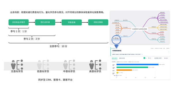 當(dāng)學(xué)員與課程產(chǎn)品交互越多,用戶畫像就會(huì)越豐富,班主任對(duì)學(xué)員的復(fù)購(gòu)、進(jìn)階意向也就掌握得更精準(zhǔn),通過量化學(xué)員關(guān)鍵行為,及時(shí)跟進(jìn)高意向?qū)W員,并對(duì)不同群體采取差異化銷售策略,以此提高學(xué)員復(fù)購(gòu)率。