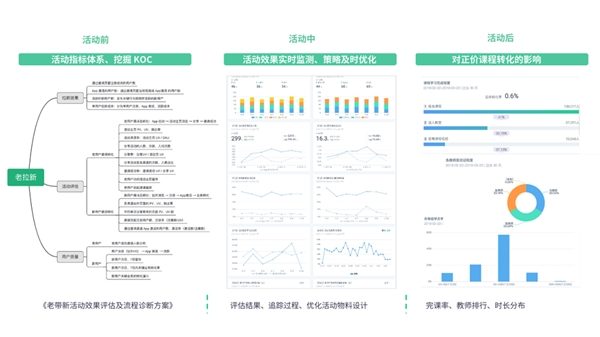 活動(dòng)后:分析活動(dòng)對(duì)用戶活躍層級(jí)、消費(fèi)層級(jí)的整體影響,選出活動(dòng)最受歡迎的課程和老師,迭代下一輪活動(dòng)策略。