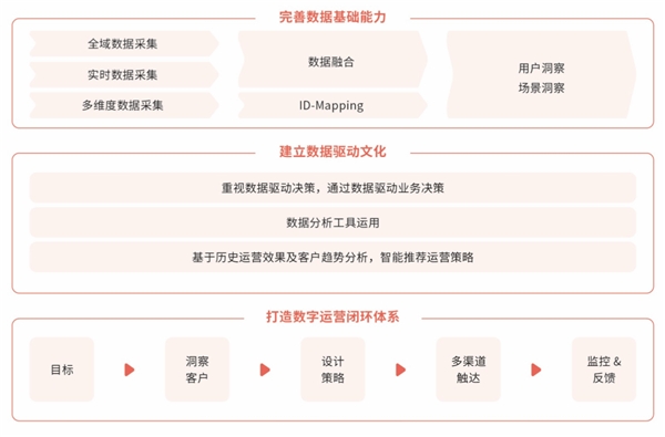 總結(jié)來說,新國貨美妝品牌在提升數(shù)字化運營能力上應(yīng)把握三個關(guān)鍵舉措:完善數(shù)據(jù)基礎(chǔ)能力、建立數(shù)據(jù)驅(qū)動文化、打造數(shù)字運營閉環(huán)體系,如下: