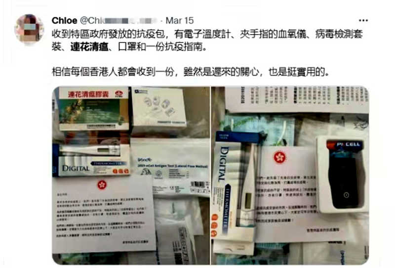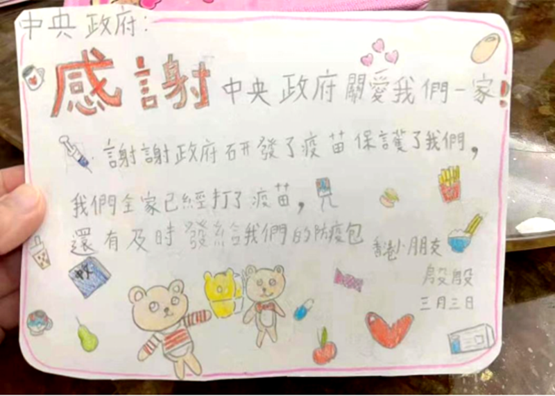 “收到特區(qū)政府發(fā)放的抗疫包,有電子溫度計(jì)、夾手指的血氧儀、病毒檢測(cè)套裝、連花清瘟膠囊、口罩和一份抗疫指南,挺實(shí)用的?!苯?#xff0c;一名居家隔離的香港居民收到政府派發(fā)的“抗疫物資包”后,在社交平臺(tái)開心的曬出圖文。更早前,一位叫殷殷的香港小朋友用自己手寫的感謝信,表達(dá)了對(duì)中央政府為香港市民提供防疫物資的感謝。隨著疫情防控的逐步深入,一個(gè)個(gè)像這樣滿載關(guān)愛的“抗疫包”越來越快地出現(xiàn)在人們手中。