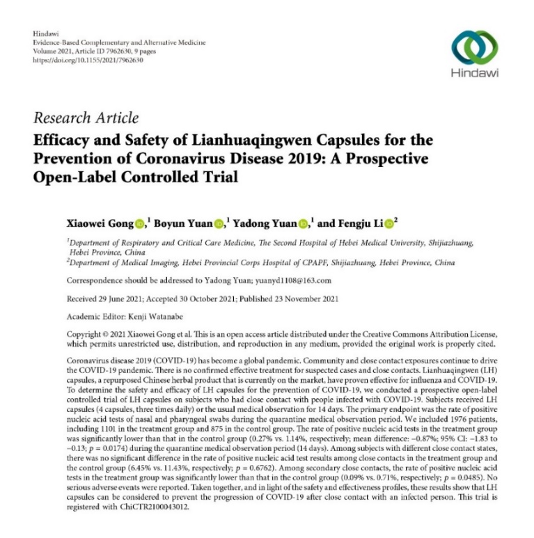 連花清瘟膠囊/顆粒預(yù)防新冠肺炎的作用得到了臨床研究的證實(shí)。前不久,由河北醫(yī)科大學(xué)第二醫(yī)院呼吸與危重癥醫(yī)學(xué)二科主任袁雅冬教授主持開展的“連花清瘟膠囊預(yù)防新型冠狀病毒肺炎”真實(shí)世界研究論文被國際權(quán)威期刊《循證補(bǔ)充和替代醫(yī)學(xué)》刊發(fā)。該論文指出,連花清瘟膠囊在有效治療流感、新冠肺炎COVID-19的同時(shí),兼具預(yù)防新冠肺炎的作用,為新冠疑似病例和密切接觸者提供了新的治療方案。