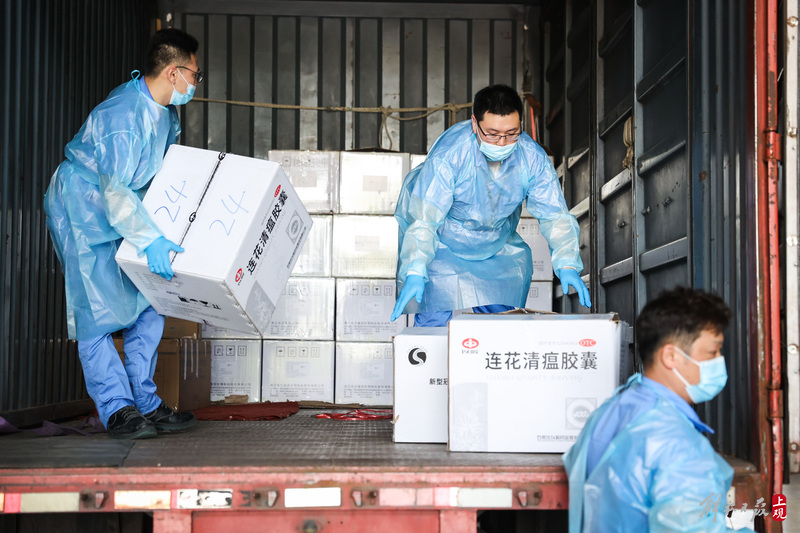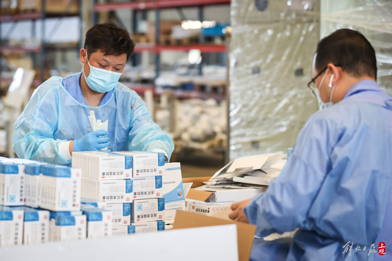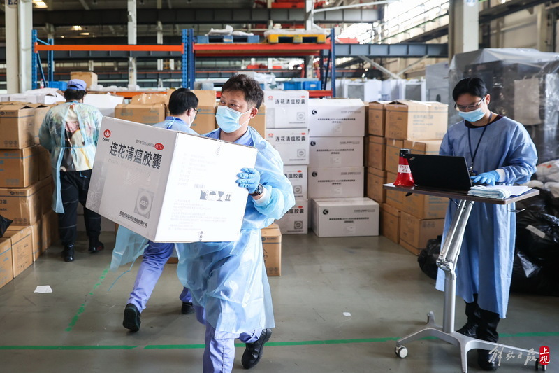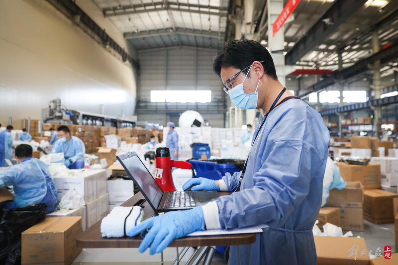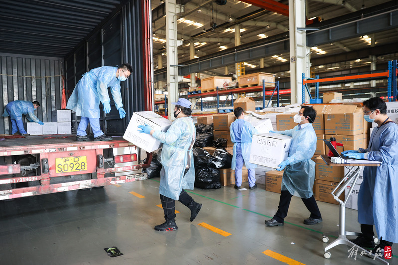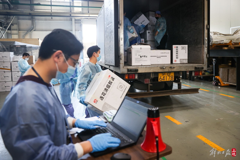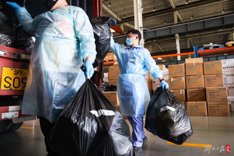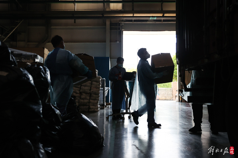 為不增加基層負(fù)擔(dān),寶山區(qū)啟用7個(gè)分揀點(diǎn)對(duì)應(yīng)13個(gè)街鎮(zhèn)園區(qū),由招募來的企業(yè)職工及志愿者流水線作業(yè),對(duì)物資開展卸貨、分裝。