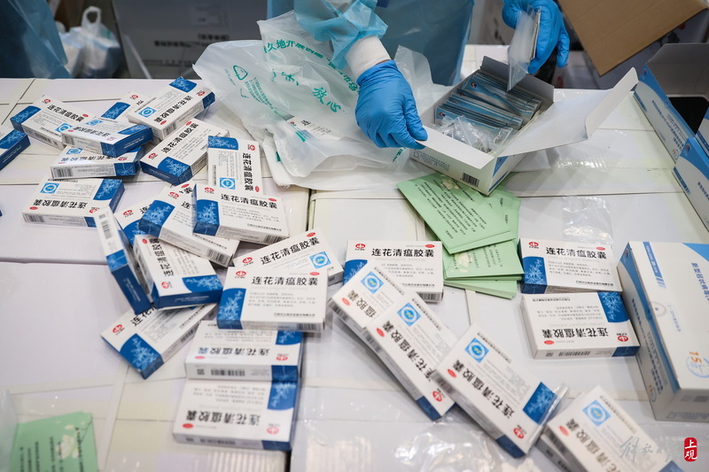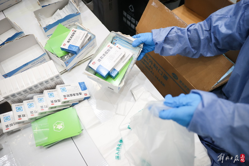 每個(gè)服務(wù)包內(nèi)有口罩、連花清瘟膠囊、抗原測試盒,并附有一張上海市疫情防控工作領(lǐng)導(dǎo)小組辦公室的心意卡。