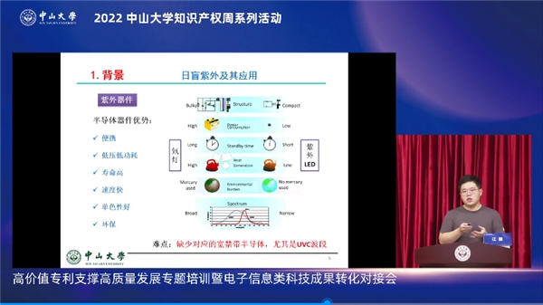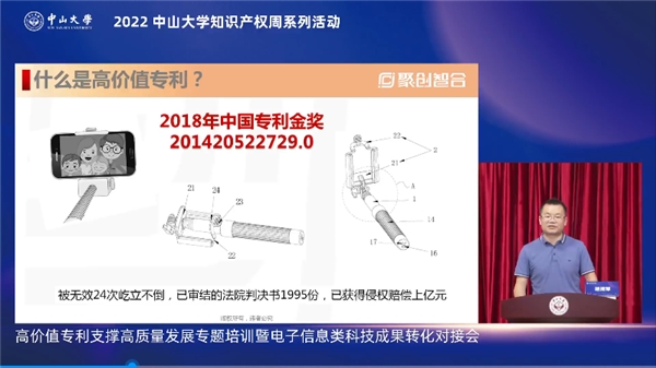 2022年4月28日,在中山大學(xué)的全程指導(dǎo)及越秀區(qū)政府的鼎力支持下,中山大學(xué)科學(xué)研究院、廣州高新區(qū)黃花崗科技園管委會、中山大學(xué)圖書館、廣州中大知識產(chǎn)權(quán)服務(wù)有限公司共同成功主辦中山大學(xué)知識產(chǎn)權(quán)周系列活動高價值專利支撐高質(zhì)量發(fā)展專題培訓(xùn)暨電子信息類科技成果轉(zhuǎn)化對接會。本次活動采取線上方式開展,邀請兩位業(yè)界專家圍繞高價值專利支撐高質(zhì)量發(fā)展做專題報告,多達(dá)178項(xiàng)電子信息類專利項(xiàng)目與83家企業(yè)進(jìn)行了精準(zhǔn)對接,活動在線人數(shù)超2.2萬人,多位知識產(chǎn)權(quán)專家及知名企業(yè)在云端匯聚,助力知識產(chǎn)權(quán)高質(zhì)量發(fā)展。