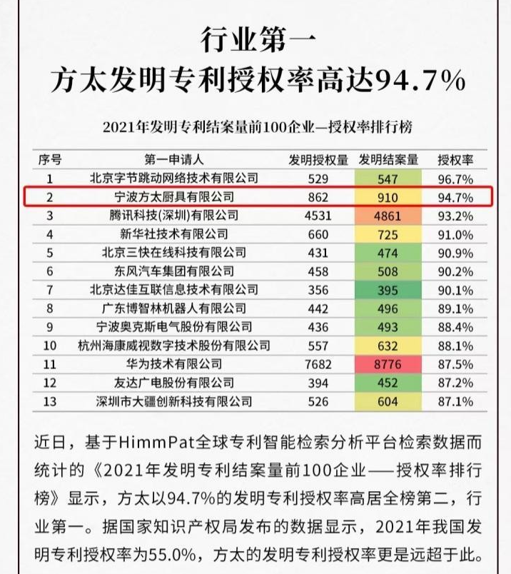 近日,基于HimmPat全球?qū)@悄軝z索分析平臺檢索數(shù)據(jù)而統(tǒng)計的《2021年發(fā)明專利結(jié)案量前100企業(yè)——授權(quán)率排行榜》顯示,廚電龍頭企業(yè)方太以94.7%的發(fā)明專利授權(quán)率高居全榜第二,行業(yè)第一。據(jù)國家知識產(chǎn)權(quán)局發(fā)布的數(shù)據(jù)顯示,2021年我國發(fā)明專利授權(quán)率為55.0%,方太的專利授權(quán)率遙遙領(lǐng)先。
