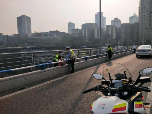 27歲的楊洋是上海英盾保安服務(wù)有限公司駐江北區(qū)公安分局交巡警支隊摩巡中隊(以下簡稱“渝警驍騎”)的一名隊員。2020年4月16日早上08時30分許,在渝澳大橋附近巡邏的楊洋突然接該支隊指揮室指令,稱渝澳大橋中間往渝中區(qū)方向有女子輕生。此時正值上班高峰期,交通堵塞嚴重。接到指令后的楊洋立馬騎上巡邏摩托車前往事發(fā)地段,在其到達離事發(fā)現(xiàn)場約10米左右的距離時,看到欲輕生女子已有一只腳跨出橋上欄桿,意欲再翻越欄桿跳下。此時有兩位民警正在耐心勸說,情況十分危急。