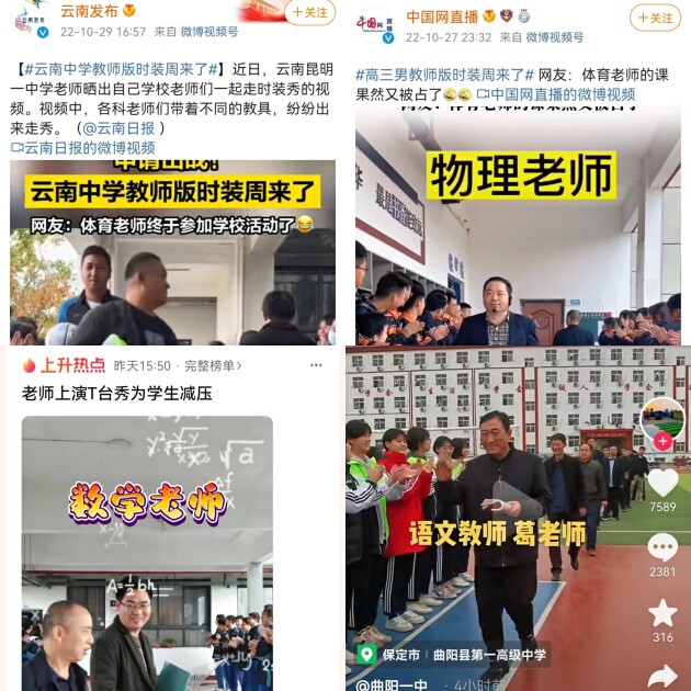 記者了解到,由于受疫情影響,不少學(xué)校采取了封控措施,為了豐富校園生活,減緩壓力,一些老師突發(fā)奇想,在校園中開展“時裝走秀”活動,并將視頻上傳至微信、微博、抖音等社交平臺,收獲了廣泛好評。之后,各地學(xué)校紛紛模仿,尤其是許多初高中任課老師“申請出戰(zhàn)”,希望通過展現(xiàn)自己的“另一面”, 讓那些背負(fù)升學(xué)壓力的同學(xué)們的緊張情緒得到有效釋放。