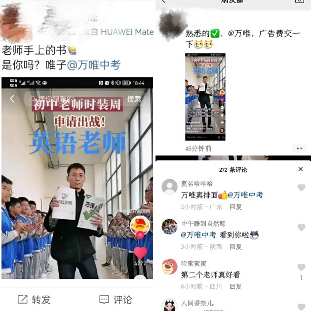 “王老師穿西服好帥啊”“吳老師真像標(biāo)準(zhǔn)的模特”“期待下一場老師T臺秀”……記者發(fā)現(xiàn),該視頻得到了大量點贊轉(zhuǎn)發(fā),幾乎每一位老師都收獲了大量評論和“粉絲”,尤其一位舉著英語資料的男教師,令許多網(wǎng)友驚呼仿佛又要考試了。原來,除了男老師“冷酷”的表情使大家聯(lián)想到自己曾經(jīng)嚴(yán)肅的老師外,還因為他手里舉著一本《萬唯中考試題研究》。據(jù)了解,《萬唯中考試題研究》在全國30個省(區(qū)市)的初中校園中廣泛使用,因此當(dāng)它出現(xiàn)時,不少網(wǎng)友直呼“熟悉”“青春回來了”。