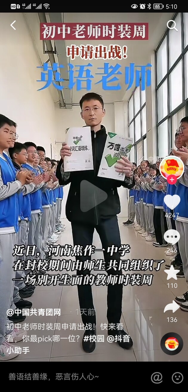 記者還注意到,“老師時裝秀”的相關(guān)視頻覆蓋面非常廣泛,在吉林、河北、河南、陜西、安徽、云南等多地校園均有出現(xiàn),其中一段河南焦作的“走秀”短視頻更是得到了中國共青團網(wǎng)抖音賬號的轉(zhuǎn)發(fā)。據(jù)悉,該視頻來源于焦作的一所初中,語文、數(shù)學(xué)、英語、物理等各科老師幾乎都參與了“走秀”,學(xué)生們在一旁喝彩鼓掌,每個人臉上都洋溢著歡樂的笑容。