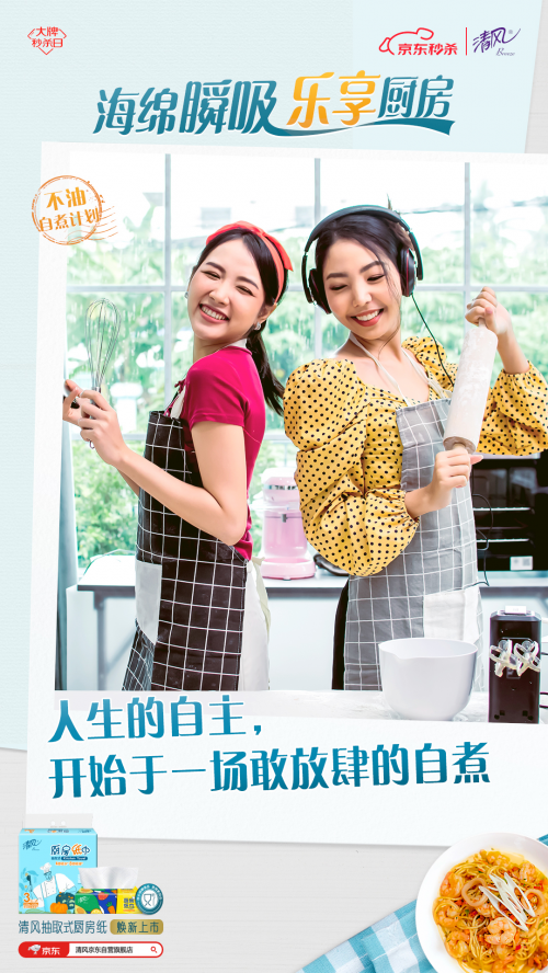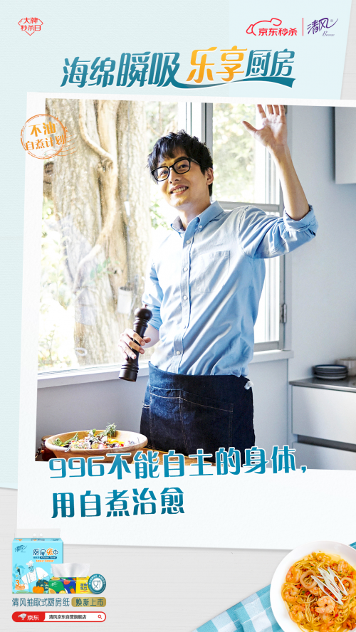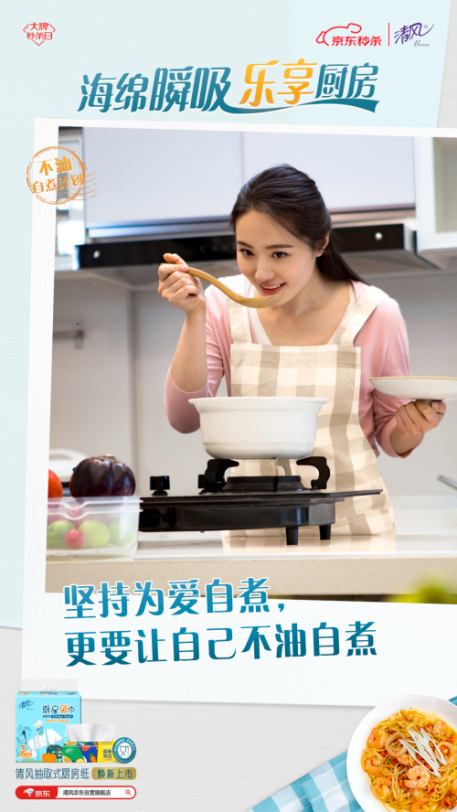 為此,清風(fēng)推出“不油自煮計劃”, 以煥新上市的清風(fēng)海綿吸廚房紙巾為依托,用“一抹即凈”的不油體驗和“一掃就會”的自煮攻略,幫助用戶破除廚房恐懼,給不同身份的用戶輕松自煮不油膩的廚房體驗,讓TA們能不由自主地愛上烹飪,輕松享受做飯帶來的快樂。