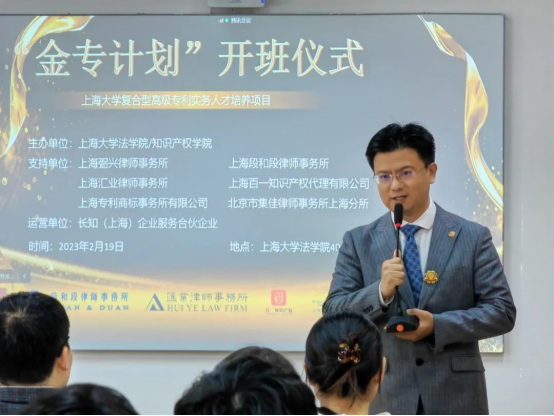 上海段和段律師事務所知識產權中心主任郭國中為“金專計劃”開班儀式致辭時表示,非常榮幸參與“金專計劃”,未來將致力于培養(yǎng)更多專利代理實務人才。