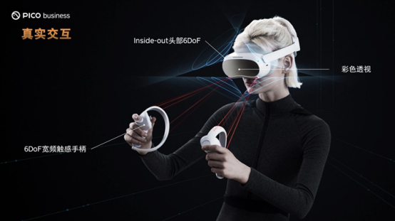 PICO 4 Enterprise憑借強大的真實交互能力,可以讓用戶能和周圍的環(huán)境產生真實的互動。它采用的6DoF空間定位配合6DoF寬頻觸感手柄,可實現(xiàn)亞毫米級定位精度和毫秒級追蹤速度,提供更加精準、自由與沉浸的商業(yè)互動體驗。搭載的彩色透視功能讓用戶在佩戴VR一體機時也能夠查看外部實時環(huán)境情況,提高安全性。