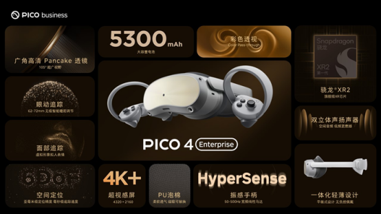 本次新品VR一體機PICO 4 Enterprise憑借強勁的性能,為用戶帶來更好的視覺體驗和更強的沉浸感。它采用的Pancake光學方案能夠實現(xiàn)105°超廣視野,精彩畫面盡收眼底。同時,其分辨率高達4320 x 2160的4K+超視感屏,最高可實現(xiàn) 90Hz 刷新率,更有1200 PPI的超清晰畫面表現(xiàn),使呈現(xiàn)在眼前的場景絲毫畢現(xiàn)、栩栩如生,仿佛置身其中。此外,PICO 4 Enterprise還搭載驍龍?XR2芯片,配備256G存儲和8GB DDR5內存,使操作更快、更流暢,內置的5300mAh大容量電池滿足更長續(xù)航。