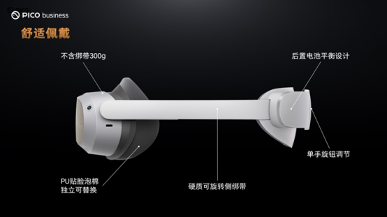 PICO 4 Enterprise采用一體化輕薄機身設計,符合人體工學,久戴也舒適。機身不含綁帶僅重300g,只比一臺常規(guī)的智能手機重一點,采用后置電池平衡設計和硬質可旋轉側綁帶,支持單手旋鈕調節(jié),大大優(yōu)化了用戶長時間佩戴的體驗。值得一提的是,PICO 4 Enterprise專為企業(yè)級用戶設計了獨立可替換的PU貼臉泡棉,相比布料的消費者版,更適合多人使用,滿足長時間佩戴的需求。