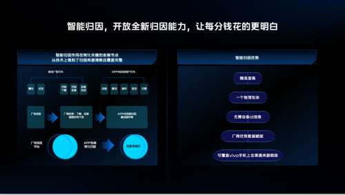 其中一個新的亮點是智能歸因能力升級。智能歸因作為不依賴于設備ID的系統(tǒng)級服務,在把握APP不同生命周期的基礎上結合用戶生命周期特點,以vivo全域效果優(yōu)化視角為客戶提供生態(tài)全域增長服務,呈現(xiàn)更全面的用戶行為鏈路,共創(chuàng)更多營銷可能性。