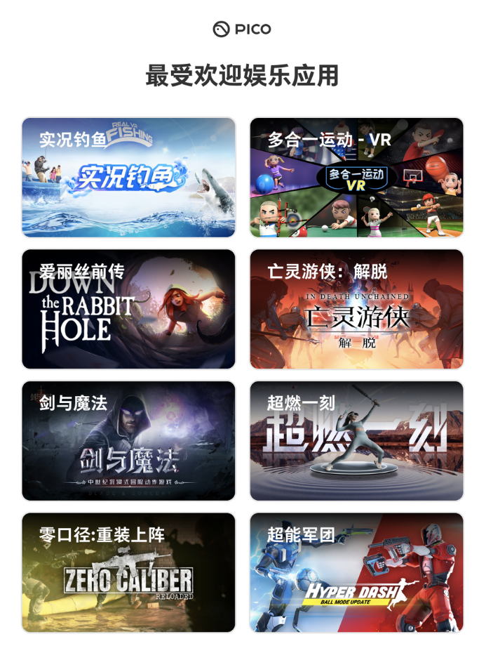 作為頭部XR品牌,PICO始終致力于幫助VR開啟大眾化之路,而豐富且優(yōu)質(zhì)的內(nèi)容和應用生態(tài),是吸引大眾消費者購買VR、使用VR的關(guān)鍵。近兩年全球VR技術(shù)日漸成熟,產(chǎn)品快速迭代,PICO作為國內(nèi)最完善的VR內(nèi)容平臺,亦在持續(xù)完善內(nèi)容生態(tài),積極加速與第三方的合作腳步,并在自制內(nèi)容方面大力投入,致力打造國內(nèi)應用最豐富、最優(yōu)質(zhì)的VR內(nèi)容平臺。迄今為止PICO應用商店已擁有超過200款國內(nèi)外優(yōu)質(zhì)的VR應用。