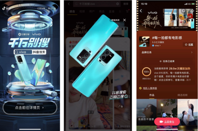 例如,在「千萬別搜」第一季中,vivo便通過兼具時(shí)尚感與科技感的創(chuàng)意開屏激發(fā)用戶點(diǎn)擊興趣,讓用戶通過點(diǎn)擊一鍵直達(dá)熱點(diǎn)品專并彈出彩蛋承接用戶興趣,進(jìn)一步聯(lián)動(dòng)#每一拍都有電影感話題轉(zhuǎn)化經(jīng)營——通過這條完整的路徑,vivo實(shí)現(xiàn)話題頁5.3億曝光、全民任務(wù)播放量超穩(wěn)定播放區(qū)間最高值1.8倍的超預(yù)期佳績。