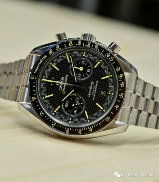 超霸Super Racing的盤面布局,是雙眼計時盤,3點位是60分鐘和12小時計時盤 (兩根計時指針是同軸的),9點位是小秒針。但凡是歐米茄9系計時機芯,都是這種布局。手表盤面上呈現(xiàn)“蜂巢”結(jié)構(gòu)。